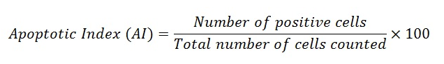 Apoptosis causes fractures in DNA. In the TUNEL method, terminal deoxynucleotidyl transferase (TdT) adds numerous dUTP-labeled deoxynucleotides to the 3’ end of a DNA strand (at 37 °C for 1 h). To detect apoptosis, in situ DNA fragmentation analysis was performed with the TUNEL (TdT-mediated dUTP nick end labeling) method. Sections with 4 µm thickness were cut from each paraffin block. After dewaxing, hydration, and serum blocking, the ApopTag Peroxidase in situ Apoptosis Detection Kit (S7100, Merck Millipore, Darmstadt, Germany) was used according to the manufacturer's protocol. After several washes, anti-digoxigenin-peroxidase was applied to the sections for 30 min at room temperature. The reaction was revealed using DAB for 6 min. After the washes, the sections were counterstained with hematoxylin for core staining. Then, the sections were examined and photographed under the light microscope, and the brown-black stained nuclei of apoptotic cells were observed. Apoptotic index (AI) was calculated in percent, using the following formula: