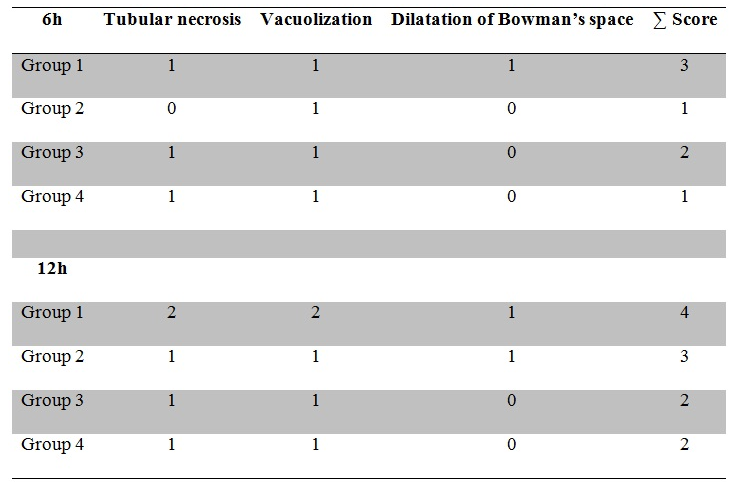 After the kidneys were removed, each sample was consecutively numbered and quickly placed in 10% neutral buffered formalin for histological examinations. Then, the kidneys were dehydrated in graded alcohol series (70%, 80%, 96% and 100%, respectively), cleared in xylene (10 min, 3 times) and embedded in paraffin wax. Then 5 µm serial sections were cut using a microtome (Leica RM 2125 RTS). The sections were stained with hematoxylin-eosin (H-E) and assessed under a light microscope (Zeiss AxioScope A1) with a camera attachment. Tubular necrosis, vacuolization and dilatation of Bowman’s space parameters were evaluated in light microscopic examinations, which employed a scale ranging from 0 to 3 as follows: