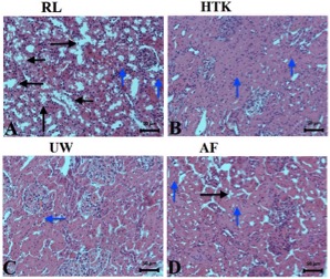 An abdominal midline incision was performed on the rats under a mixture of 50 mg/kg Ketamine hydrochloride (Ketalar®, Pfizer, Turkey) and 10 mg/kg Xylazine (Rompun®, Bayer, Canada) anesthesia. The renal artery was entered with a polyethylene catheter, and relevant solutions for each experimental group (cooled to + 4° C) were injected, and the kidneys were perfused. The renal vein was cut, and kidney perfusion continued until clear fluid came from the vena renalis. Then nephrectomy was performed. After nephrectomy, all rats were sacrificed with high dose anesthetic administration. The removed kidneys were placed in Falcon tubes each containing + 4° C RL, HTK, UW, or AF solutions (15 ml), and stored at + 4° C for 12 hours. Tissue samples were taken from the perfused kidneys for histopathological examination at 6th and 12th hours. After 12 hours of storage, samples from kidney tissues were fixed in 10% neutral buffered formalin.