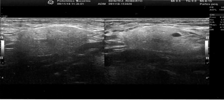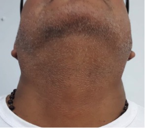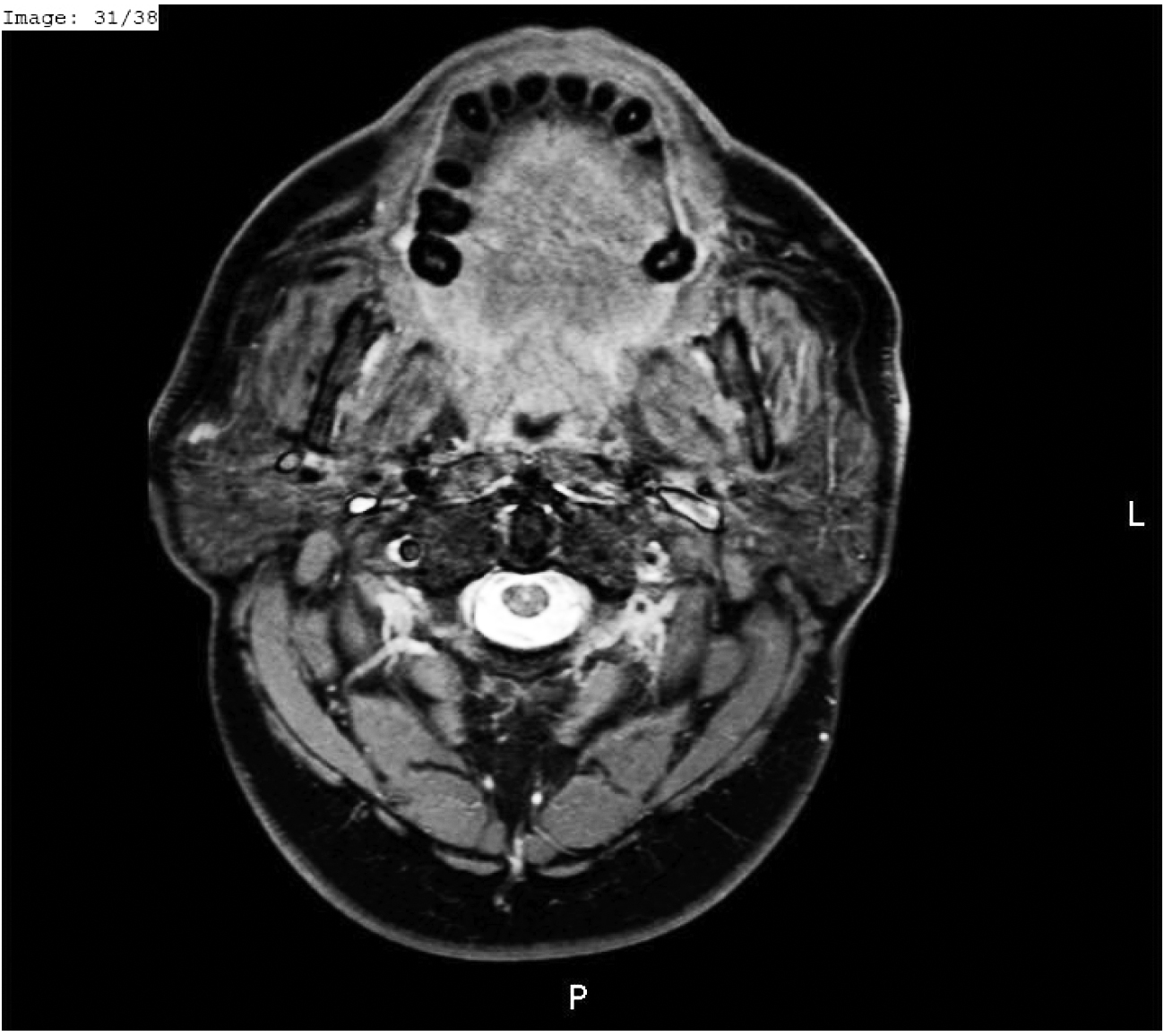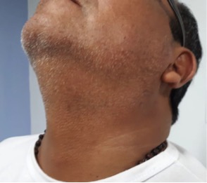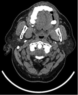 Durante la primera semana del mes de noviembre de 2018 le efectúan una TC de encéfalo y tórax con contraste EV (iopamidol); 36 horas más tarde, el paciente concurre a la consulta relatando dolor en región submandibular y cuello. Minutos después de finalizar el estudio comienza a percibir molestias mal caracterizadas en dichas zonas, notando edema progresivo y dolor. Al examen se constata tumefacción de región submandibular, retromandibular, cuello y piso de la boca, Lóbulos de las orejas desplazados hacia afuera, simétricos. Se palpan las seis glándulas salivales principales agrandadas de manera simétrica, dolorosas, sin rodetes eritematosos en las desembocaduras de los conductos salivales. Las glándulas submaxilares se palpan de forma ovoide y miden aproximadamente 6 cm de largo, se encuentran tensas y despiertan intenso dolor (Imagenes 1 y 2). El resto de las glándulas principales muestran similares características palpatorias. Niega fiebre y sus equivalentes.