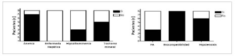 Con respecto a los factores de morbilidad y mortalidad considerados en pacientes con ERC, observamos la presencia de anemia en 7, hipoalbuminemia en 3 y trastornos del metabolismo óseo mineral, incluidas calcificaciones vasculares, en 5. La Figura 2 muestra la presencia de factores específicos relacionados a pacientes que reciben tratamiento hemodialítico. No se encontró asociación estadística entre factores de morbilidad y mortalidad considerados en pacientes con ERC y los EV ni entre factores específicos relacionados a pacientes que reciben tratamiento hemodialítico y los EV.
