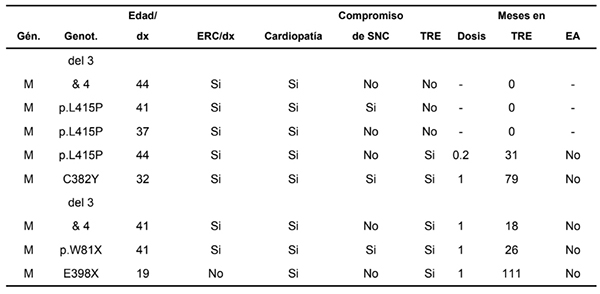 Gén: género; M: masculino; Genot: genotipo; ERC/dx: presencia de enfermedad renal crónica al momento del diagnóstico de la enfermedad de Fabry; SNC: Sistema nervioso central; TRE: terapia de reemplazo enzimático; EA: eventos adversos relacionados a la administración de terapia de reemplazo enzimático