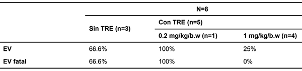 EV: evento vascular; TRE: terapia de reemplazo enzimático; 0.2 mg/kg/b.w: 0.2 miligramos cada 15 días; 1 mg/kg/b.w: 1 miligramo cada 15 días