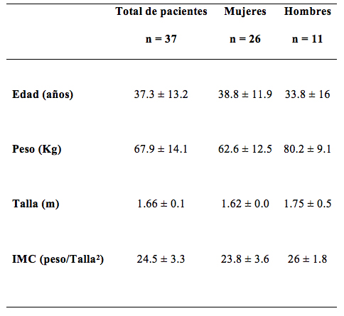 En la Tabla 1 se muestran los datos demográficos totales (n=37) de pacientes con litiasis renal y espongiosis renal, divididos entre mujeres y hombres. Observamos un predominio de mujeres, relación 2.4:1, con edades similares entre los sexos y obviamente mayor altura, peso e IMC en los hombres. Macro o micro hematuria estuvo presente en 17 de los 37 pacientes (46%). Antecedente de infección urinaria se encontró en 22 pacientes (59.5%) sin diferencias entre mujeres y hombres. Antecedentes familiares de litiasis renal de primer grado (madre, padre, hermanos o hijos) estuvo presente en 13/24 (35%) y de segundo grado (abuelos, nietos, tíos, primos o sobrinos) en 1/34 (3%). Presentaron espongiosis renal bilateral 28/37 (75.7%) y unilateral 9/37 (24.3%). Nefrocalcinosis, presente en radiografías o tomografía computada y eventualmente en ultrasonografía fue observada en 35/37 pacientes (95%) con diferentes grados de severidad. Si descartamos la ecografía (como técnica poco específica) la nefrocalcinosis estuvo presente en el 59.5% (n=22). Hipertensión arterial se observó en 8/37 (22%). En 20 pacientes (54%) su pudo obtener la composición del cálculo. El oxalato de calcio correspondió a 16/20 pacientes (80%), ácido úrico a 2/20 (10%), fosfato de calcio a 1/20 (5%) e hidroxi-apatita + struvita a 1/20 (5%).