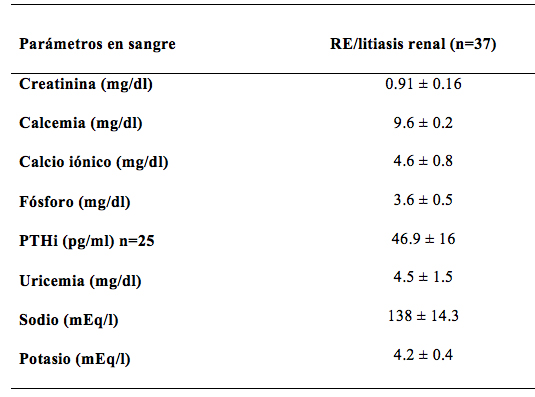 Los pacientes, sin alteraciones bioquímicas definidas, fueron considerados como sin actividad metabólica (SAM).La pérdida renal de fosfato (PRP) fue definida por un fósforo sérico inferior a 2,8 mg/dl y un umbral renal (URP) inferior a 2,4 mg/dl, normalizado para una tasa de filtración glomerular estimada por el clearence de creatinina (TmPO4/GFR; rango normal 2.5-4.2 mg/dl). La saturación urinaria se calculó en la mayoría de los pacientes, con un programa computarizado (ACTILIT), que evalúa el riesgo relativo (RR) de cristalización de diferentes sales. De nuestros pacientes con litiasis renal y RE (37), determinamos la composición química utilizando el método colorimétrico (comparación visual) y en el 10% restante mediante cristalografía óptica con luz polarizada. Como criterio de exclusión consideramos a pacientes con clearence de creatinina <50 ml/min, que presentaran infección urinaria en el momento del estudio o que estuvieran recibiendo medicación que pudiera afectar los resultados. Es de destacar que la edad considerada en esta serie, fue tomada en el momento del diagnóstico metabólico de la litiasis renal.