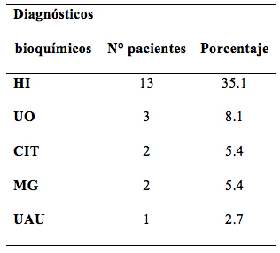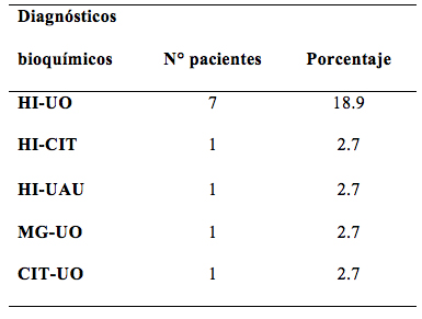 En la Tabla 2se muestran los parámetros bioquímicos basales de los 37 pacientes, mientras que en la Tabla 3se exponen las alteraciones bioquímicas únicas, en el total de los pacientes y la Tabla 4 muestras las alteraciones asociadas. Como se observa la HI es el diagnóstico más frecuente, representando como diagnóstico único o combinado el 59.4% del total. La segunda alteración tanto como única o asociada fue la hiperuricosuria, presente en el 32.45%. La hipocitraturia, la hipomagnesuria y el pHu persistentemente ácido compartieron el 8.1% como alteración única o asociada. La hipomagnesuria la encontramos sólo en mujeres, mientras que la hiperuricosuria predominó en los hombres. Es de destacar que el bajo número de hombres dificultó la comparación de los géneros. Sin actividad metabólica (SAM) la observamos en 5 pacientes (13.5%). No se encontraron pacientes con bajo volumen urinario y el pHu promedio fue de 5.9 + 0.5. El URP disminuido se observó en tres pacientes (8.1%) independiente de la alteración bioquímica que presentaban.