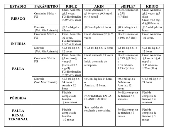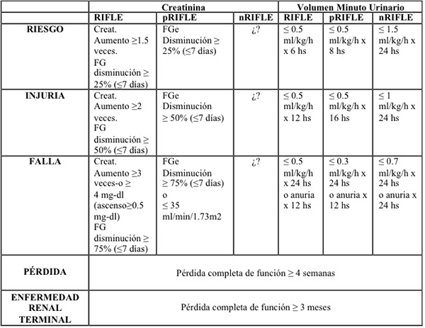 La definición “tradicional” de fallo renal agudo era amplia y poco precisa, resultando imposible comparar diferencias en su prevalencia y factores pronósticos de gravedad entre diferentes centros y/o poblaciones.(12) Reconociendo la necesidad de una definición más uniforme del fallo renal agudo, un grupo de especialistas en nefrología de adultos, nefrología de niños y en cuidados críticos (Acute Dialysis Qualty Initiative Group) estableció una clasificación del fallo renal según su severidad. Propuso una serie de criterios diagnósticos con diferentes grados de IRA a los que llamo criterios RIFLE(13) (del idioma inglés: Risk (riesgo), Injury (daño), Failure (fallo). (Tabla1)