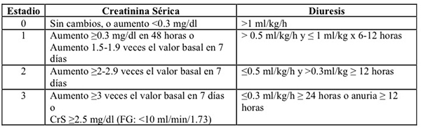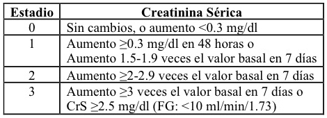La clasificación AKIN propuso como criterio diagnóstico de AKI un aumento brusco, dentro de las 48 h, en la creatinina sérica ≥0.3 mg/dl del valor basal, o un porcentaje de aumento ≥50%, también dentro de las 48 h, o la presencia de oliguria: <0.5 ml/kg/hora durante más de 6 h. La estratificación de injuria renal en esta clasificación, también tiene 3 estadios de gravedad, que corresponden a riesgo-risk (estadio 1), injuria-injury (estadio 2), y falla-injury (estadio 3), similar a los criterios RIFLE. Los estadios 4 y 5 (LOSS y ESRD), fueron removidos de esta clasificación dado que no se los considera grados de gravedad, sino medidas de resultado y mortalidad. Los pacientes con terapia de reemplazo renal se incluyen en estadio 3, de acuerdo al Consenso AKIN, por su variabilidad en el tiempo y por el tipo de terapia de reemplazo renal indicada.(11)
