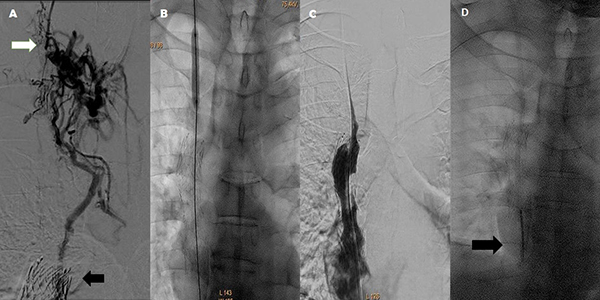 Debido a la necesidad de diálisis de urgencia, se realiza una punción guiada por ecografía de un segmento permeable y muy disminuido de calibre de la vena yugular interna derecha con un Abbocath 18 G y a través del mismo se efectúa una flebografía que muestra la oclusión de la vena yugular interna derecha con escasa opacificación de la vena cava superior por circulación colateral (Figura 1A). Luego, se coloca un introductor 8 Fr y, con una guía 0.035” hidrofílica, se logra negociar la oclusión descripta y se la progresa a través del stent implantado en la vena cava superior hasta la vena cava inferior. Para permitir el pasaje del catéter transitorio de diálisis, se realiza angioplastia con balón (Figura 1B) lográndose la revascularización del vaso (Figura 1C). A continuación, se coloca un catéter transitorio Arrow de 12 Fr por 20 cm a nivel de la aurícula derecha sin complicaciones (Figura 1D). El paciente se encuentra en hemodiálisis post-procedimiento sin complicaciones.