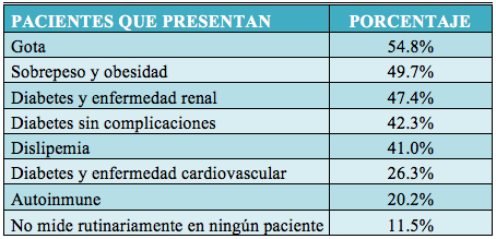Respecto al tratamiento, solo refirieron tratarlo si presentaban ER un 62.5%, con DM 61.7%, síndrome metabólico 60.4%, enfermedad cardiovascular 50.3%. En caso de tener gota, cálculos renales o dolor articular, eran tratados en un 91.3%, 74% y 36.1% respectivamente, pero estas cifras descendieron a 53.1%, 50% y 19.1% si los valores séricos eran normales.