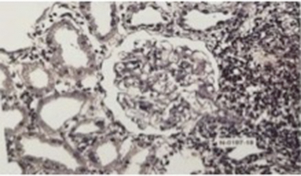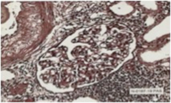 A los 70 días del trasplante, 4 de enero de 2019, por incremento de proteinuria hasta 1.2 g/día sin deterioro de la función renal, se amplían pruebas para diagnóstico de infección viral con resultado de PCR para adenovirus de 4.920 copias (negativo menos de 10 copias) y exámenes que reportaron leucocitos 2.23 x 106/L, linfocitos 0.89 x 106/L, neutrófilos 1,08 x 106/L, hemoglobina 7.0 g/dl, hematocrito 21.2%. Se reduce dosis de inmunosupresores e ingresa para iniciar tratamiento con inmunoglobulina (0.5 gr/kg), dos dosis previa realización de nueva biopsia de injerto renal, la cual reportó nefritis tubulointersticial viral. (Figuras 1-A y 1-B)