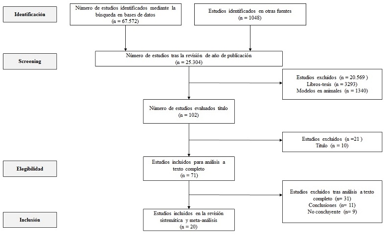Se recuperaron 68.620 artículos científicos tras limitar la búsqueda desde enero de 2007 a 2018, en bases de datos indexadas (EBSCO, SciELO, MedLine, Medscape, PubMed Central, EMBASE, REDALYC, DOAJ, OVID). Se excluyeron inicialmente 27.348 artículos duplicados, 25.304 artículos fueron examinados para su elegibilidad, descartando 102 según el título o el resumen. Por otro lado, se evaluaron los textos completos de 71 estudios potencialmente elegibles. De éstos, 20 estudios cumplieron con los criterios de inclusión (Figura 1), en donde 8 fueron estudios experimentales(14-21) y 12 revisiones sistemáticas y/o metaanálisis(8,11-12,22-,23,24,25,26,27,28,29) que no incluían los 8 estudios experimentales que seleccionamos en la presente investigación.