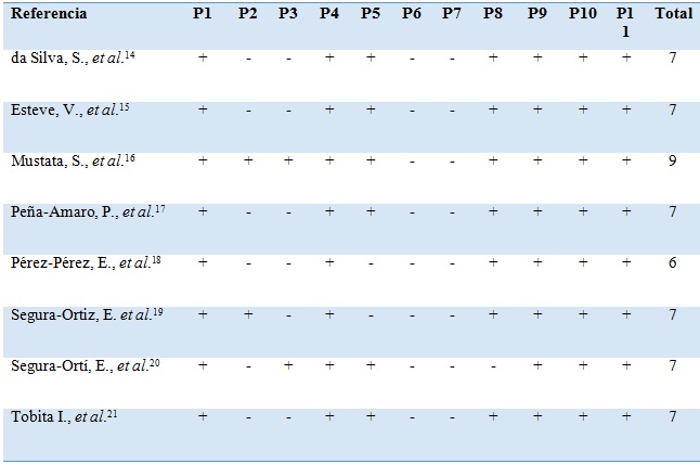 El riesgo de sesgo también fue valorado mediante la escala de PEDro(13) (en inglés Physiotherapy Evidence Database). La escala de PEDro consta de 10 apartados que evalúan la validez interna (criterios 2-9) y la información estadística de los ensayos clínicos (criterios 10 y 11). Esta escala, basada en la lista Delphi, asigna 1 o 0 punto según se cumpla o no con el ítem que se evalúa. Para la interpretación de los resultados obtenidos en la escala de PEDro nos basamos en los criterios de Moseley et al.,(14) que indica que toda investigación con un resultado post escala PEDro igual o mayor a 5/10, puede ser considerada de alta calidad metodológica y de bajo riesgo de sesgo. (Tabla 1)