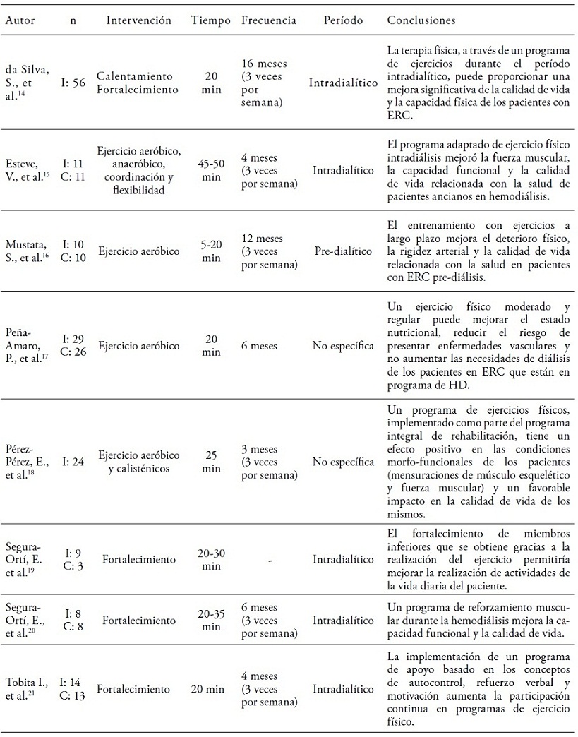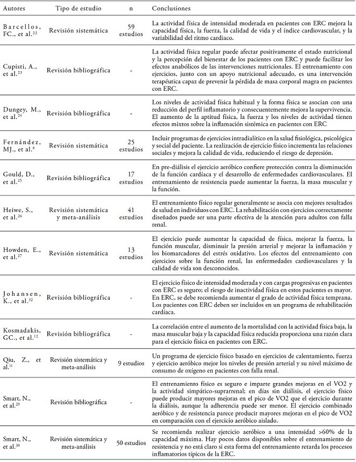 Esta revisión buscó demostrar la importancia de un programa de rehabilitación física en ERC. Se identificaron 20 estudios (8 estudios experimentales y 12 estudios de revisión) que exponen los efectos de la intervención fisioterapéutica en pacientes con falla renal.