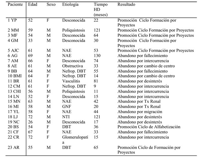 Entre los años 2011 y 2018, participaron del programa 23 pacientes, todos con nivel educacional de primario incompleto, edad promedio 58.1 años DS 10.7, tiempo en diálisis promedio 48 meses DS 36.5, sexo femenino (13 pacientes), sexo masculino (10 pacientes). No hubo diferencia significativa respecto al promedio de edad (58.1 vs 61.7 años, p=0.3), el tiempo en diálisis (48. vs 49.7 meses, p=0.3), ni la etiología de IRCT (p=0.8) entre los pacientes que ingresaron al programa de escolarización y el resto de la población asistida.