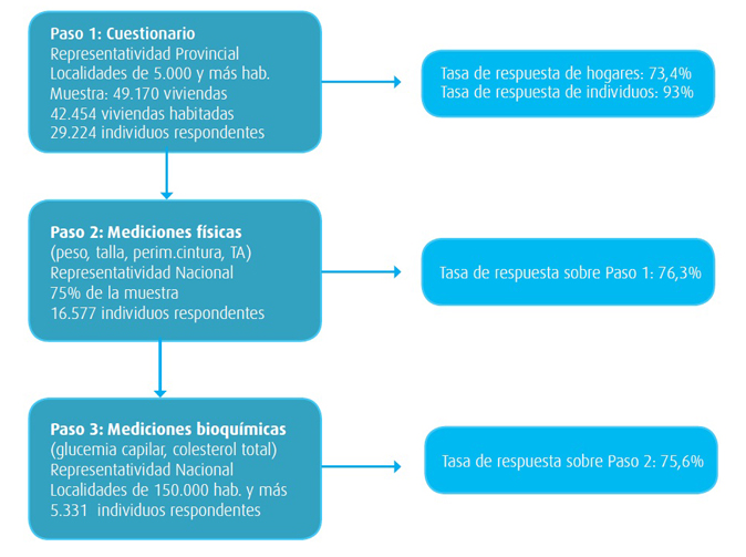 El paso #1 consistió en el relevamiento por autorreporte, con un cuestionario nuclear muy similar al de las ediciones anteriores de la ENFR. Permitió obtener información representativa, en el ámbito nacional y provincial, de la población de 18 años y más, residente en localidades urbanas de 5.000 y más habitantes. El paso #2 incluyó la realización de mediciones físicas que relevaron presión arterial y parámetros antropométricos como peso, talla y perímetro de la cintura. Para cada una de ellas se utilizó el instrumental correspondiente de acuerdo a las recomendaciones internacionales: tensiómetro digital, tallímetro, balanza portátil y cinta métrica. Por último, el paso #3 de determinaciones bioquímicas, consistió en la realización de mediciones de glucemia capilar y colesterol total en ayunas. Todo el operativo de campo se realizó bajo la coordinación general del INDEC y las DPE.