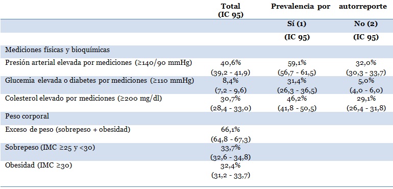 El 30,7 % de los individuos registró colesterol elevado, en los cuales no se reconoció colesterol elevado en la etapa de autorreporte; tres de cada diez individuos tuvieron registros elevados en la determinación capilar. El 8,4 % de la población de referencia registró glucemia capilar elevada en la etapa de mediciones bioquímicas de la encuesta. El 5 % de los individuos que no declararon tener glucemia elevada o diabetes por autorreporte, tuvieron registros elevados de glucemia.