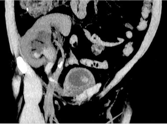 Bladder lavage showed several clots. In the following 24 hours she progressed to hemorrhagic shock with respiratory dysfunction and need for invasive mechanical ventilation and progressive worsening of renal function, with serum creatinine of 4.55 mg/dL. Pelvic computed tomography (CT) revealed calyx and pelvis duplicity and ureter bifidity which merged into a single ureter and inserted into the right anterolateral wall of the bladder (Figure 2). The inferior ureter was enlarged due to an obstructive clot, close to the confluence between ureters, without dilatation of the superior one. She underwent a cystoscopy that revealed a large placenta of clots, and washing was done. Ventilatory weaning occurred without intercurrences and a double J ureteral catheterization was performed on the lower ureter with progressive improvement of renal function and resolution of hematuria. She was discharged on the seventh day of re-hospitalization.