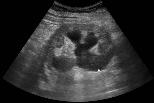 Forty-seven year-old caucasian woman, with hypertensive chronic renal disease (CKD), underwent renal replacement therapy with hemodialysis for one year and was transplanted with a cadaver renal graft 13 years ago. She was admitted at our nephrology department to perform an ultrasound-guided biopsy of the renal graft, using a 16‐gauge spring‐loaded biopsy gun. This procedure was made to clarify the worsening of renal function, with elevation of serum creatinine to 1.8 mg/dL. The patient had normal blood pressure, wasn’t taking any anticoagulant or antiplatelet medication and had a normal INR and platelet count. Six hours later, she presented with macroscopic hematuria. She underwent intravenous hydration and urethral catheterization. In the first hour, our patient urinated 1.000 cc of hematic urine without clots. During the following days she maintained good urine output, with progressive improvement in hematuria and serum creatinine, and was discharged. That same day, she returned to our service due to the reappearance of macroscopic hematuria. The analytical study revealed a worsening of the serum creatinine value (2.83 mg/dL) and de novo anemia, with hemoglobin of 8 gr/dL (baseline value 11.4 g/dL). The allograft Doppler Ultrasonography revealed (US) dilation of the lower and middle calyx groups, with functional compromise (with higher resistivity index) associated with obstructive nephropathy. (Figure 1)