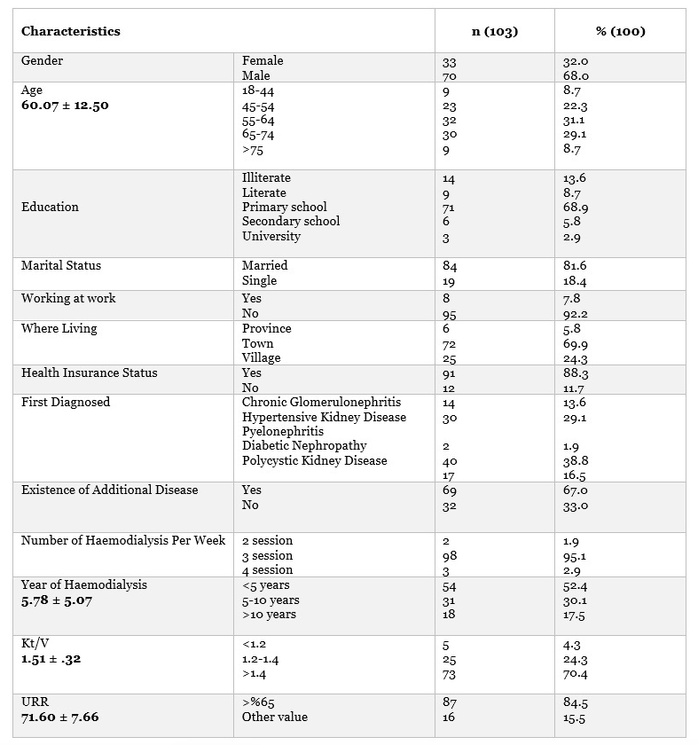 3.1. Demographic features The findings showed that the mean age of haemodialysis patients is 60.07 ± 12.50; 68.0% are male, 68.9% are graduates of primary education, 81.6% are married, 92.2% are unemployed, 69.9% live in the town, and 88.3% have social security. It was also found that 38.8% of the patients’ haemodialysis start diagnoses are diabetic nephropathy, 67.0% have a minimum of one additional disease, 95.1% receive dialysis 3 times a week and 30.1% are receiving haemodialysis for 5-10 years (5,78 ± 5,07). (Table 1)
