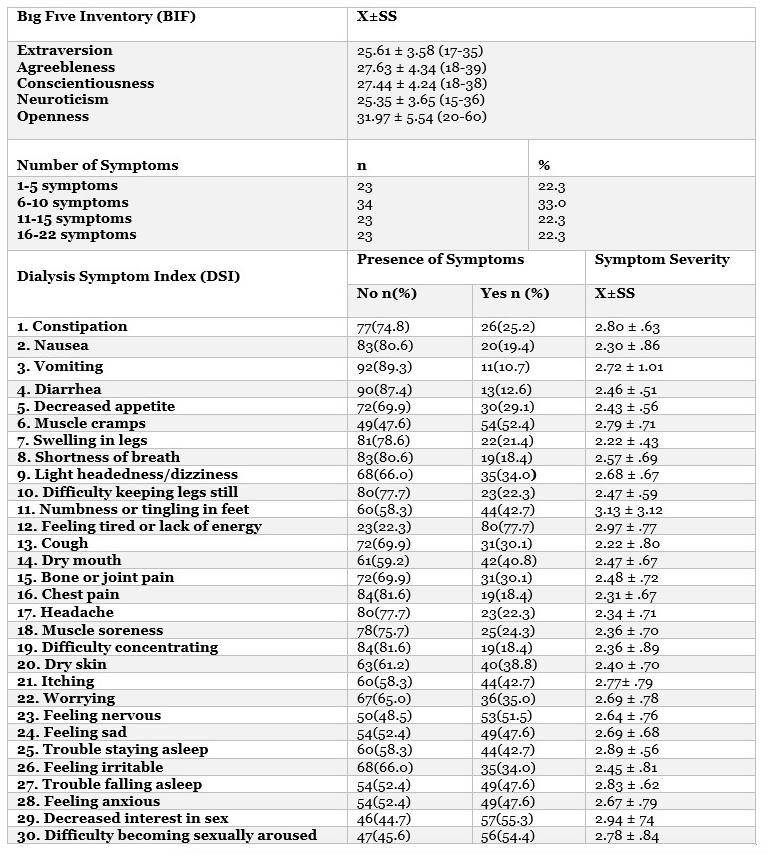 Evaluation of haemodialysis adequacy has a critical role in clinical practices. Hence, a series of haemodialysis adequacy indices are used in studies and clinical settings.(2, 10-11) One of the most frequently used dialysis adequacy measurement method is the urea kinetic model (Kt/V) developed by Daugirdas and it can be personalized for all patients as a scale of haemodialysis adequacy. The K in Kt/V is the dialyzer clearance, t is the dialysis duration, V is the urea distribution volume.(12) Studies have shown that high (>1.2) Kt/V value is associated with longer life span, less complication and better quality of life.(10-11, 13) The Big Five personality traits (neuroticism, extraversion, openness to experience, agreeableness, conscientiousness) define individual permanent and inter-culturally valid characteristics that are known to influence unlimited number of health results such as disease load and health behaviour.(14-15) Generally, agreeableness, openness to experience and conscientiousness is associated with good health perception, and neuroticism is associated with bad health perception.(14, 16-19) Previous studies conducted with haemodialysis patients showed that patients with high agreeableness, openness to experience and conscientiousness traits can better maintain their self-discipline and more easily adapt to dialytic treatment.(19-20) On the other hand, patients with neuroticism trait have difficulty in sustaining motivation, usually give up before completing jobs, expect to be encouraged to achieve goals and thus, have lower adaptation rate to the treatment.(17, 19-20) Neuroticism was also found to be the sole predictor of depression symptoms in dialysis patients.(16, 18) Studies conducted on the factors affecting symptoms of haemodialysis patients are mostly limited to demographic and clinical features. No study was found in the literature focusing on the relation between the physical and psychological symptoms experienced by haemodialysis patients and their personality traits. Investigation of the impact of other relevant factors on symptoms on haemodialysis patients will contribute to better understanding of symptom burdens and effective symptom management. This study is significant owing to the fact that it is one of the first studies to investigate the relation between personality traits, haemodialysis adequacy and symptoms of haemodialysis patients.