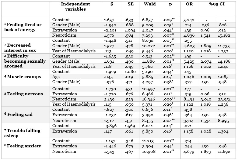 The predictors of the most common symptoms in the study were examined via logistic regression analysis; and the results determined men gender, age, haemodialysis year, extraversionness, and neuroticism. URR and Kt/V values were not located in any of the models.