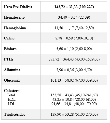 En todos los pacientes se realizaron pruebas analíticas que incluyeron hemograma, albuminemia, proteína c reactiva (PCR), colesterol total, colesterol LDL, colesterol HDL, triglicéridos, calcemia, fosfatemia y glucemia. Dichas determinaciones fueron medidas con un autoanalizador Express Plus, CIBA Corning (EE.UU.). En todos los pacientes se realizaron determinaciones de PTHi mediante electroquimioluminiscencia (autoanalizador IMMULITE DPC Siemmens).