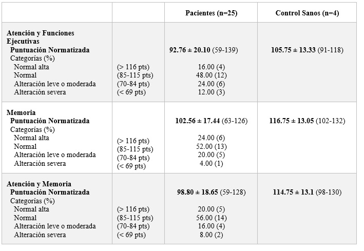 Ningún paciente había recibido evaluación neurocognitiva previamente, por lo que no se contó con datos previos. En relación a los resultados del test Neuropsi (Tabla 2), al valorar atención y funciones ejecutivas, los pacientes obtuvieron una puntuación normatizada promedio de 92.8 ± 20.1, siendo el 16.0% normal alta, el 48.0% normal, el 24.0% alteración leve o moderada y el 12.0% alteración severa. Al analizar memoria, la puntuación normatizada promedio fue de 102.6 ± 17.4, presentando un 24.0% de los pacientes normal alta, 52.0% normal, 20.0% alteración leve o moderada y 4.0% alteración severa. Al evaluar atención y memoria de manera conjunta, la puntuación normatizada promedio fue de 98.8%, presentando el 20.0% de los pacientes normal alta, 56.0% normal, 16.0% alteración leve o moderada y 8.0% alteración severa.