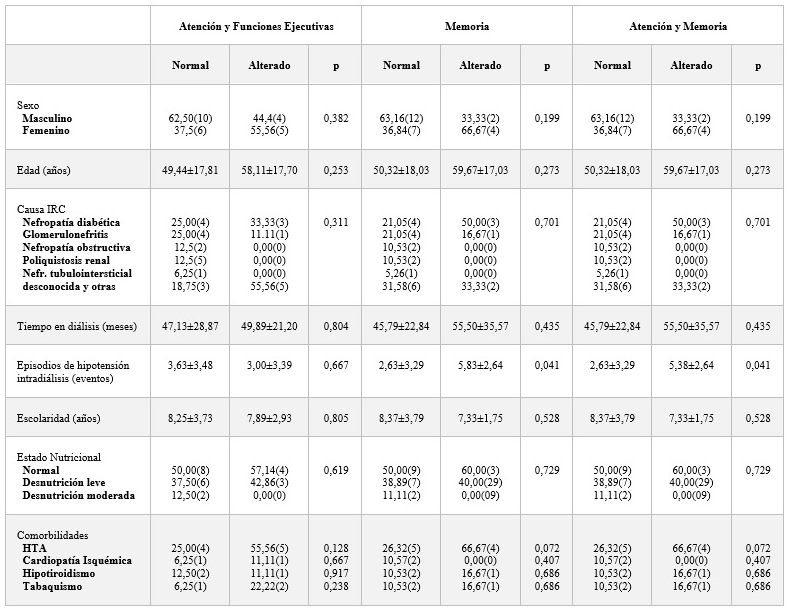 Al analizar memoria, el grupo de pacientes que presentaban resultados alterados tenían mayor proporción de mujeres (66.7% vs 36.84 %, p= 0.199), eran más añosos (59.7 ± 17.0 vs 50.3 ± 17.0; p= 0.27), con mayor proporción de pacientes diabéticos (50.00% vs 21.05%; p= 0.70) y con mayor tiempo bajo terapia dialítica (55.50 ± 35.57 vs 45.79 ± 22.84, p= 0.43), aunque sin significación estadística. Fue estadísticamente significativa una mayor cantidad de episodios de hipotensión intradialítica en el grupo de pacientes con pruebas alteradas (5.83 ± 2.64 vs 2.63 ± 3.29; p= 0.04). Además, en este grupo había una mayor proporción de pacientes con HTA como comorbilidad (66.7% vs 26.3%; p= 0.07). No hubo diferencia significativa en cuanto al estado nutricional entre ambos grupos.