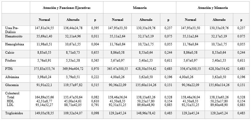 Al analizar atención y funciones ejecutivas, se observó que el grupo de pacientes con resultados “Alterados” presentaba mayor proporción de mujeres y edad más avanzada (58.1 ± 17.7 vs 49.4 ± 17.8 años), aunque sin significación estadística. También existía una mayor proporción de pacientes con IRC de causa desconocida. No hubo diferencias significativas en cuanto al tiempo en diálisis, episodios de hipotensión intradialítica, escolaridad, ni estado nutricional. Sí hubo mayor cantidad de pacientes con HTA, cardiopatía isquémica y tabaquismo como comorbilidad. (Tabla 3)