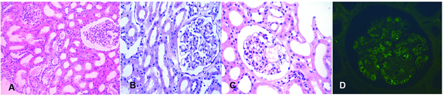 Primera biopsia renal: (a y b) MO: 11 glomérulos; (a) por HE y (b) por PAS presentan túbulos con vacuolización irregular y necrosis focal, signos compatibles con NTA, ausencia de rechazo celular agudo. IFI negativa. C y D. Segunda biopsia renal: (c) MO: se observan en el glomérulo microtrombos aislados y en mesangio, mesangiolisis con ectasia de luces capilares en varios glomérulos; (d) IFI: IgG ++/4 en capilares glomerulares y peritubulares; IgM: +/4 en capilares glomerulares y peritubulares; IgA: +/4 en capilares glomerulares; C3: +/4 en capilares glomerulares; C1q: negativa; fibrinógeno: ++/4 en pared de capilares glomerulares y peritubulares, cadenas kappa; ++/4 y cadenas lambda: +++/4 en capilares glomerulares. Sin signos de rechazo celular agudo ni mediado por anticuerpos. Escleroatrofia <10%. C4d negativo. Virus BK negativo