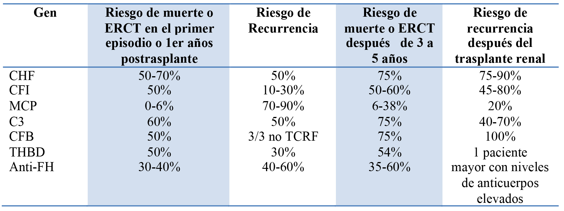 Anti CFH: anticuerpo anti factor H; CFB: gen del complemento factor B; CFH: gen del complemento factor H; CFI: gen del complemento factor I; ERCT: enfermedad renal crónica terminal; MCP: gen de la proteína cofactor de membrana; THBD: gen de la trombomodulina. Adaptado de Loirat(11)