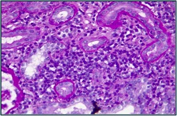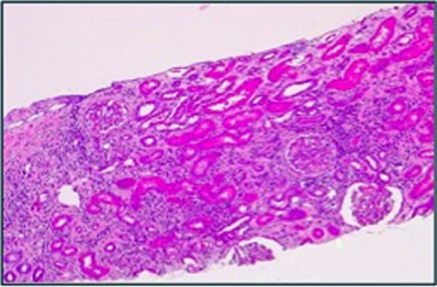 Biopsia renal: diez glomérulos, uno con alteraciones de tipo isquémicas, el resto sin alteraciones significativas; numerosos infiltrados intersticiales linfoplasmocitarios difusos que invaden y destruyen focalmente las membranas basales tubulares; atrofia tubular y fibrosis intersticial en parches que comprometen el 15% del material evaluado; arteriolas con leve hipertrofia de su capa muscular. La inmunofluorescencia resultó negativa. Figura 1 - 2.