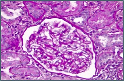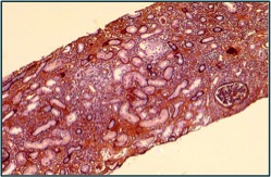 Acudió a consulta nefrológica doce días después, presentando al examen físico buen estado general, TA 140/80, normohidratado, sin particularidades. Laboratorio: Hto. 35, GB 10.500, (S 58,8%, L 21,8%, E 11,3%, B 0,7%, M 7,4%), urea 36 mg%, Cr 3,2 mg%, calcio 9,7 mg/dl, fósforo 3,6 mg/dl, GOT 27 UI/l, GPT 18 UI/l, C3 y C4 normales, serologías hepatitis B, C y HIV negativas, PCR 1,76, proteinuria 1,62 gr/24hs, sedimento urinario normal.