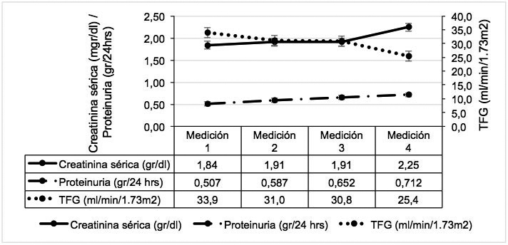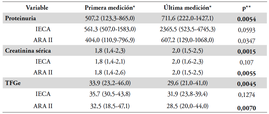 En la Tabla 1 se muestra el análisis bivariado, contrastando la primera y la última medición de seguimiento en todos los pacientes. La proteinuria, la creatinina y la TFGe mostraron progresión de daño renal, con incrementos de significancia estadística en el total de los pacientes incluidos y en el grupo con ARA-II. La creatinina sérica tuvo un incremento en 11% (p= 0,0015) y una reducción de la filtración glomerular de 4.3 ml/min en 1 año de seguimiento (p= 0,0001) y fue consecuente estadísticamente al grupo que recibió ARA-II (p= 0,0070).