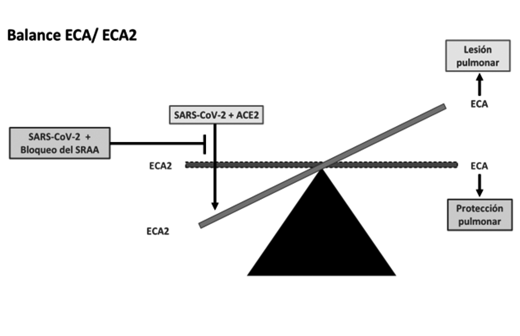 Se conocen varias publicaciones ya desde 2005, que muestran interacción entre el SRAA y ECA2, con variantes anteriores de coronavirus y otros virus respiratorios.(4) De acuerdo con estas, la proteína de la corona viral del SARS-CoV-1 interacciona con el receptor ECA2, al que utiliza como vía de entrada a la colonización celular y, en el mismo proceso, reduce la disponibilidad de ECA2 sistémica. Existe sólida evidencia de que niveles adecuados de ECA2 son esenciales para la protección del funcionamiento de las células pulmonares, y cuando se desregula este mecanismo protector y predominan los efectos proinflamatorios de la angiotensina II sin oposición, se favorece el consiguiente daño tisular. Mantener un balance adecuado entre la enzima convertidora de angiotensina (ECA) de la vía clásica y la ECA2 (balance ECA/ACE2) parece ser esencial para la integridad funcional del pulmón. Se ha observado que los ratones deficientes para ACE muestran un daño pulmonar muy atenuado, y también que el ACE2 recombinante puede proteger a los ratones de una lesión pulmonar aguda grave, existiendo sustento experimental que demuestra el efecto de los bloqueantes del SRAA en modelos animales protegiendo contra el daño pulmonar por SARS-CoV-1, dato ratificado en otras publicaciones, que también mostraron efecto protector de estas drogas contra el daño pulmonar por coronavirus.(5-6)