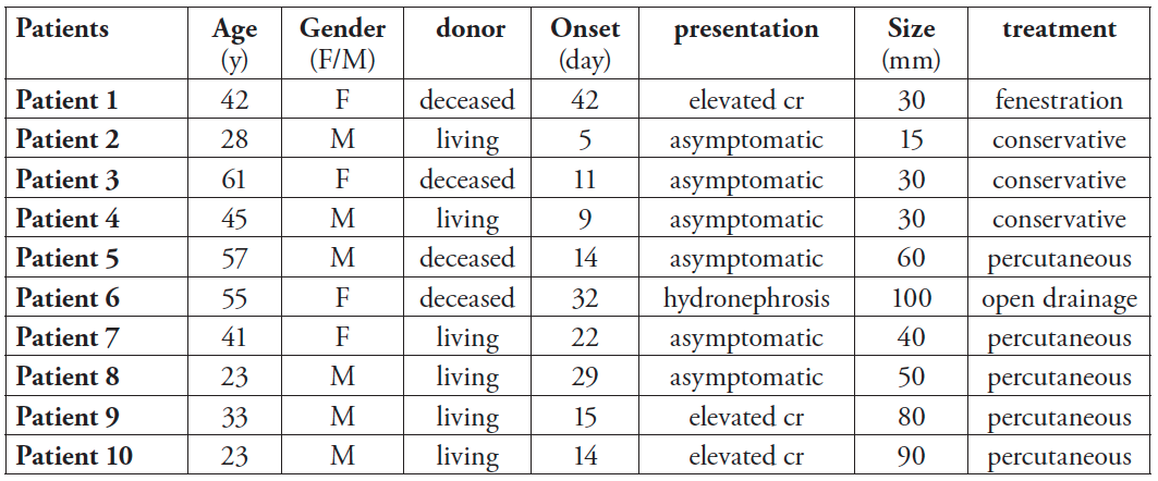 Abstract: Introduction: The lymphocele is a common complication following renal transplantation and may cause significant clinical problems especially when reachs to big volumes. The aim of this study is to present the clinical characteristics, diagnostic approaches, and therapeutic strategies of lymphocele formations in a group of Turkish patients. Methods: A total of 244 renal transplantations were included in this retrospective study. Data of patients who were diagnosed with lymphocele during the postoperative period were analyzed. Results: Ten (2.4%) patients have been diagnosed with lymphocele. There were six males and 4 females, with a mean age of 46 years. The median onset was 19 days posttransplantation. The median size of the lymphoceles was 53 mm. All lymphoceles were localizated between the lower pole of the transplanted kidney and urine bladder. On presentation, one patient had hydronephrosis and three patients had elevated serum creatinine while the remaining six ones were asymptomatic. Five patients were successfully treated by percutaneous aspiration whereas two patients required surgery. Three patients’ lymphoceles dissolved spontaneously. Conclusion: Preventive strategies including preserving the lymphatics of the recipient, careful organ retrieval and ‘back table’ work are of great importance to reduce the incidence of lymphocele. Early decision of radiological or surgical intervention should be considered in patients with symptomatic lymphoceles in order to prevent further complications.