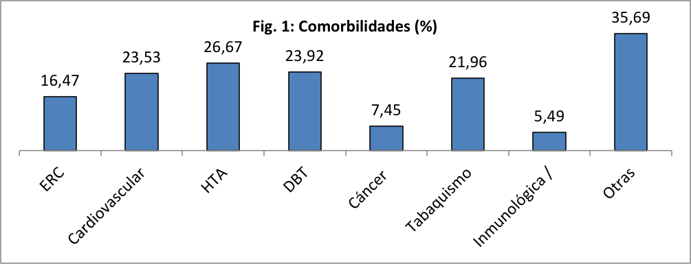 Según datos del Censo Nacional de Población 2010, el 29% de la población mayor de 14 años posee únicamente cobertura de salud pública, correspondiendo, en la provincia de Santa Fe, a 781.802 personas (Estimaciones y proyecciones elaboradas en base a resultados del Censo Nacional de Población, Hogares y Viviendas 2010, del INDEC).(18) En los años 2017 y 2018 recibieron TRR por IRA 255 pacientes, representando 163,81 ppm/año y 1,85/1000 internaciones/año en los efectores participantes (Sala de situación de la provincia de Santa Fe). El 70,98% eran varones con una edad promedio de 46,66 ± 14,88 años (rango: 15-84). El 71,37% presentaba comorbilidades, las más frecuentes fueron HTA (26,67%), DBT (23,92%), cardiovasculares (23,53%) y ERC (16,47%). (Figura 1)