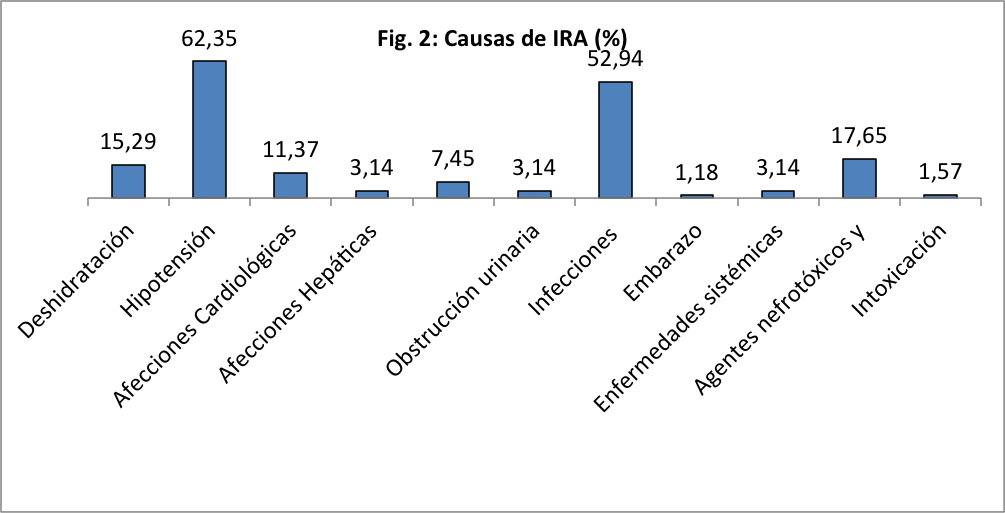 Respecto a las causas de IRA, las tres principales fueron hipotensión arterial (HipoTA) en el 62,35% de los casos, infecciones en el 52,94% y agentes nefrotóxicos en el 17,95 %. (Figura 2)
