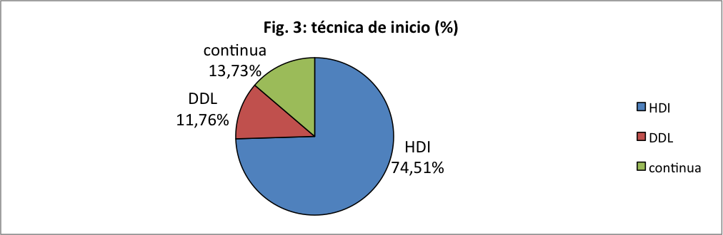 En la evaluación de la infraestructura pudo determinarse que el 100% de los centros contaba con máquinas de HD con UF controlada y utilizaba agua tratada y membrana biocompatible. Las técnicas de TRR utilizadas en la primer sesión fueron: hemodiálisis intermitente (74,51%), diálisis lenta (11,76%), diálisis continua (13,73%) y diálisis peritoneal (0%). (Figura 3)