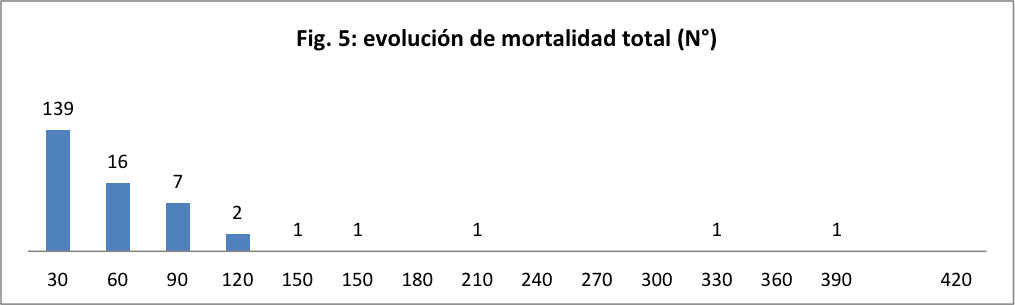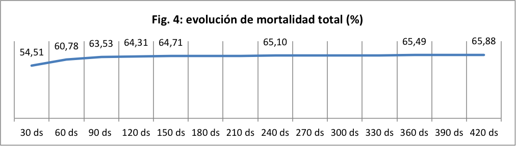 La Cr p promedio en la primera diálisis fue 5,63 mg/d. El promedio de sesiones recibidas fue de 7,42 por paciente. Respecto a la evolución, se encontraban vivos a los 30 días, desde la primera sesión registrada, 116 pacientes (45,49%), de los cuales 12 (10,34%) ingresaron en plan de HD crónica. La mortalidad a los 30 días, desde la primera sesión, fue del 54,51% y siguió progresando hasta el 65,88% a los 420 días. El 90% de estos óbitos tardíos se produjo dentro de los seis meses subsiguientes al desarrollo de IRA con requerimiento de TRR. (Figuras 4 . 5)