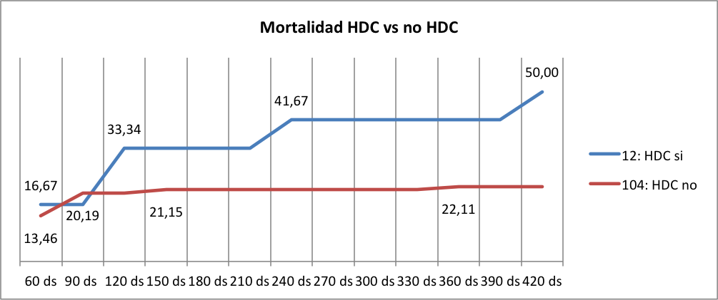 Recientemente, Kellum et al.(53) encontraron que aquellos pacientes que no recuperan la función renal tienen peor pronóstico con una sobrevida al año del 40%. Estos resultados son similares a nuestro hallazgo de 50% de mortalidad a los 420 días entre aquellos pacientes DDC.