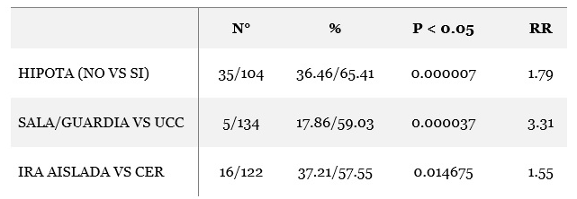 En cuanto a la mortalidad a 30 días desde la primera sesión, no se encontró diferencia significativa en relación con edad, sexo, tipo de TRR, comorbilidades ni creatininemia en primera diálisis. La proporción de fallecidos fue significativamente mayor (p <0,05) en aquellos pacientes con CER respecto a aquellos con IRA aislada (RR: 1.55), internación en UCC versus Sala o Guardia (RR: 3.31) e HipoTA (RR: 1.79) como causa. (Tabla 1)