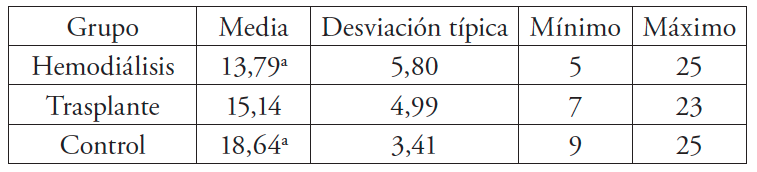 La Tabla 1 muestra los resultados relativos a la SV de los tres grupos considerados en el estudio. Como se observa, los pacientes en HD son los que presentan un menor nivel de SV, seguidos por los pacientes que han recibido trasplante renal. La satisfacción más alta la registran los participantes del grupo control. Para verificar si las diferencias observadas pueden considerarse significativas, se comprobó en primer lugar el supuesto de homoscedasticidad. Al analizar homocedasticidad en sus componentes, homo (igual) y cedasticidad (dispersión), veremos que de la unión de ambas tenemos una misma dispersión. Al no cumplirse, se aplicó la prueba de Tamhane, cuyos resultados indican diferencias significativas entre el grupo de HD y el grupo control. El resto de las diferencias no resultan significativas a nivel poblacional.