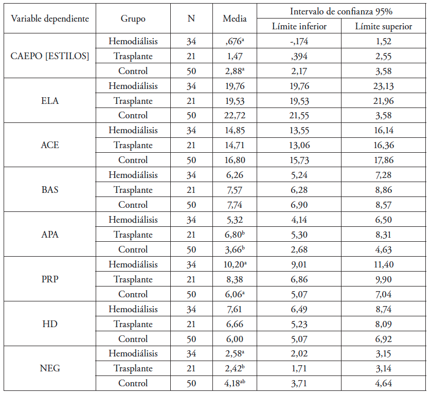 Con base en estos análisis se puede afirmar que existen diferencias estadísticamente significativas en la puntuación total de la escala de afrontamiento entre el grupo de HD y el grupo control. Estos dos grupos también se diferencian en el estilo de afrontamiento basado en la pasividad y resignación pasiva (PRP), siendo significativamente mayor para el grupo en HD. Por su parte, el grupo de pacientes con trasplante renal se diferencia del grupo control por un mayor afrontamiento basado en la ansiedad y en la preocupación ansiosa (APA). Por último, los dos grupos de IRC se diferencian del control al utilizar estrategias de afrontamiento basadas en la negación (NEG) en menor medida que en la población normal.