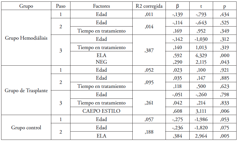 Para determinar qué subescalas del CAEPO pudieran predecir la SV de los participantes, se realizó un análisis de regresión lineal para cada uno de los grupos. Así, se introdujeron como variables predictoras en la ecuación de regresión todas las medidas de afrontamiento –CAEPO [ESTILO], ELA, ACE, BAS, PRP, APA, HD y NEG– y, como variable criterio, la puntuación de los participantes en la escala SWLS, controlando en los grupos clínicos las variables edad y tiempo de tratamiento. De esta manera, para las variables relativas al afrontamiento se optó por el método de pasos sucesivos con una probabilidad de F para entrar de < ,05 y para salir de F > ,100. Todas las ecuaciones de regresión resultaron ser estadísticamente significativas. Se indican los datos para el grupo de HD [F(4, 33) = 6,210, p= ,001], para el grupo de trasplante [F(3, 20) = 3,35, p= ,044] y para el grupo control [F(2, 49) = 6,683, p= ,003]. El resumen de los parámetros más relevantes de estas ecuaciones de regresión se muestra en la Tabla 3. Como se observa, en todas las ecuaciones se han incorporado variables predictoras relativas al estilo de afrontamiento.