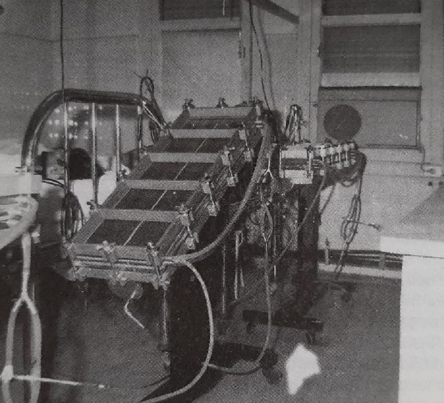 El hemodializador de planchas paralelas modelo Calvo se utilizó por primera vez el 25 de marzo de 1965 en ese servicio, que para fines de ese año ya contaba con diez de estos equipos, más una central de provisión de dializado que los abastecía simultáneamente (Figura 2).(27) Las tubuladuras de sangre del circuito extracorpóreo habían sido diseñadas por los nefrólogos y construidas en PVC. Posteriormente, a escala industrial, fueron fabricadas por un laboratorio nacional (Laboratorio PL Rivero SRL). En este servicios, entre 1965 y 1972, se hicieron cerca de 10.000 sesiones de HD con estos riñones de placas.(19, 28)