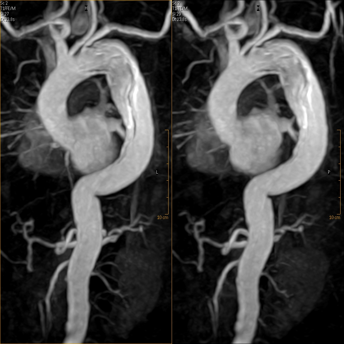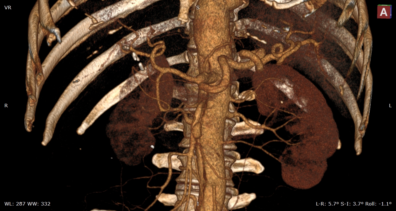Resumen: Se presenta el caso de un paciente masculino con diagnóstico de disección aórtica tipo B con compromiso vascular renal derecho, que evoluciona con injuria renal aguda sin requerimiento de terapia de soporte renal. En el estudio tomográfico se constató la presencia de 3 arterias renales izquierdas y un riñón derecho hipotrófico secundario a litiasis, comprometido por flap de disección aórtica.