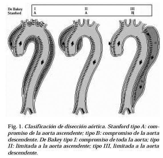 Tipo A: afecta la aorta ascendente; puede interesar también el cayado y la aorta descendente. Tipo B: se circunscribe a la aorta descendente. (Imagen 1)