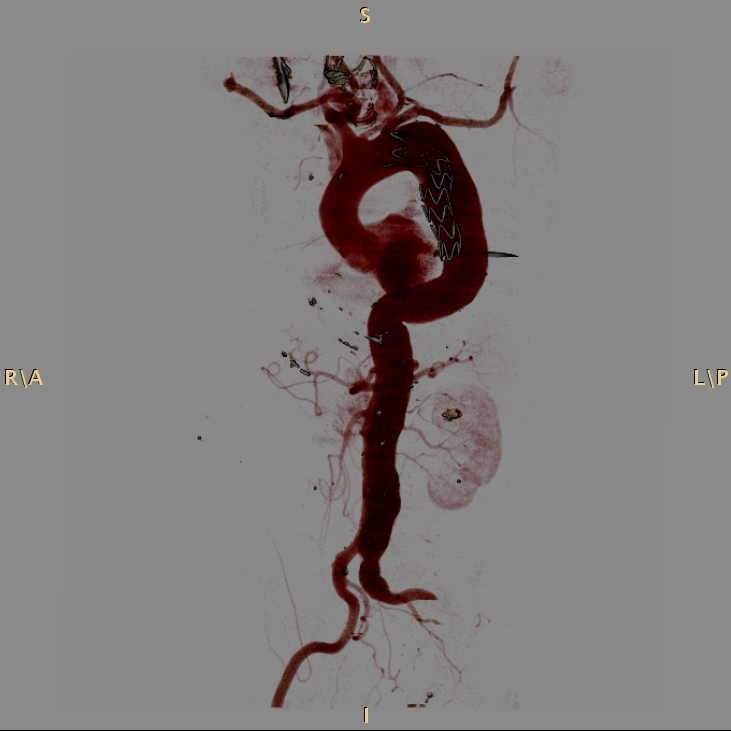Se decidió colocación de endoprótesis torácica RELAY de 32 mm de diámetro por 155 mm de longitud por el Servicio de Hemodinamia y Cirugía Vascular. Presentó como intercurrencia infección tracto urinario por E. Coli tratada con imipenem ajustándose dosis a la función renal. El paciente evolucionó favorablemente con descenso de los valores de su función renal (creatinina al alta 1.55 mg/dl).